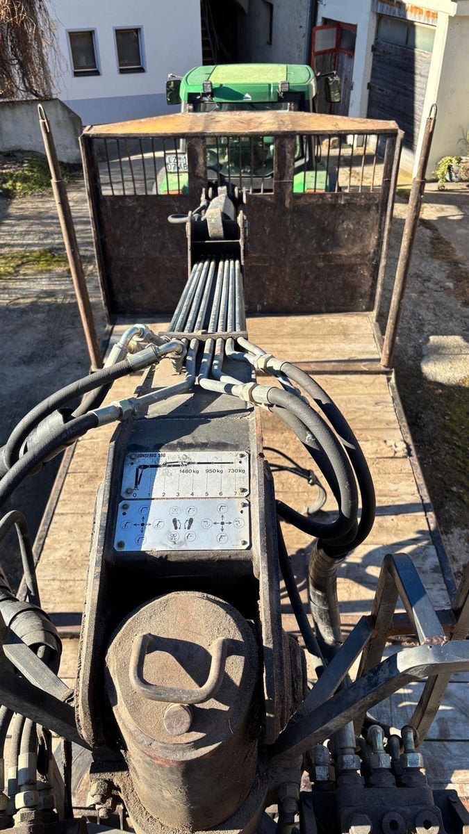 Holzhänger Eigenbau mit Jonsered 590 Kran, Reichweite 7,5m, Druckluftbremse, Beleuchtung, Ladevolumen 11 FM, Eigenölversorgung über Zapfwellenpumpe, großer Hydrauliköltank mit Ölfilter, Öffnungsweite Holzzange 1,4m, gefedertes Tandemaggregat, Privatverkauf wegen Betriebsauflösung.
